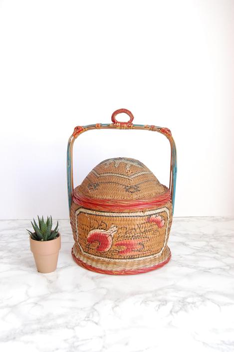 Antique 21h chinese wedding basket with wood carved handles woven sides and top.